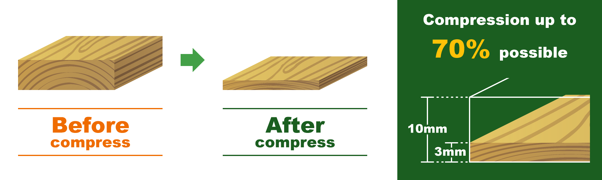 10mm thick plate can be compressed to 3 mm. We will provide products with compression ratio according to application and usage condition Products of our compression technology will not return to the original even if it is attached in water. Expansion and shrinkage is also suppressed without impairing the humidity control function due to moisture absorption and release.