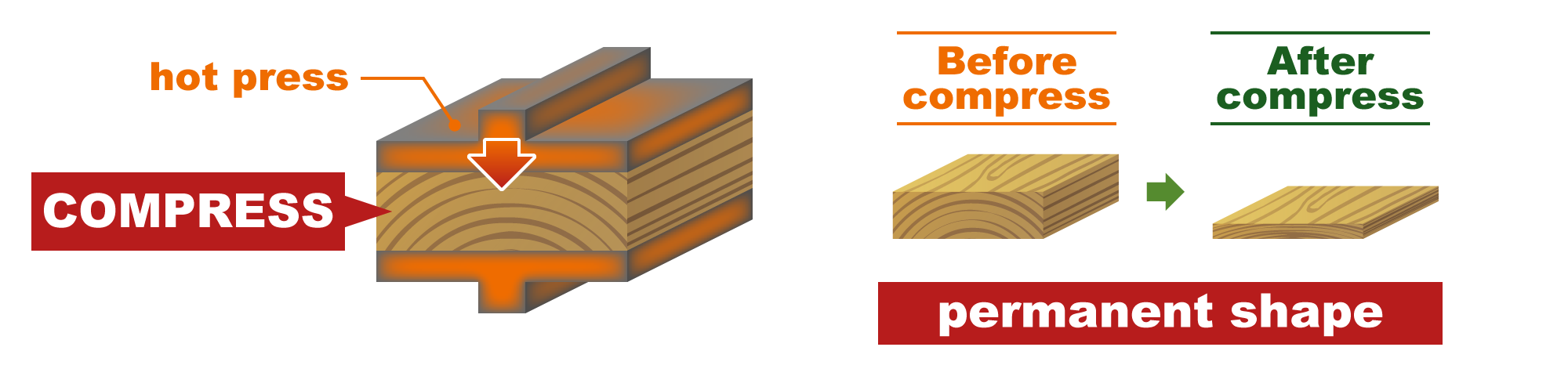 Compression processing of Palmholtz is done for a long time with high temperature and high pressure in a press machine. Since the whole is uniformly compressed, the hardness of the board improves and the shape persists permanently.